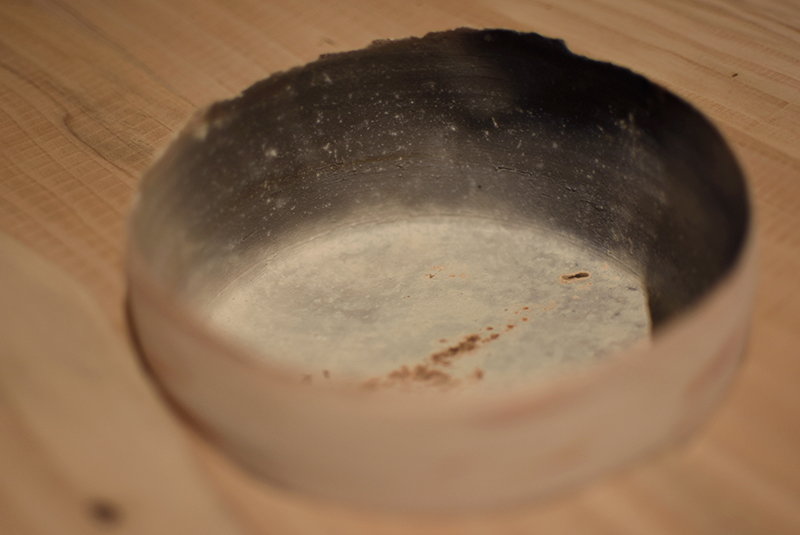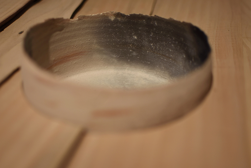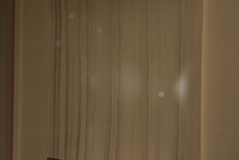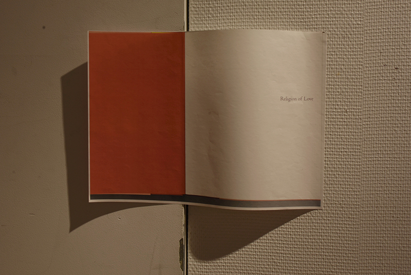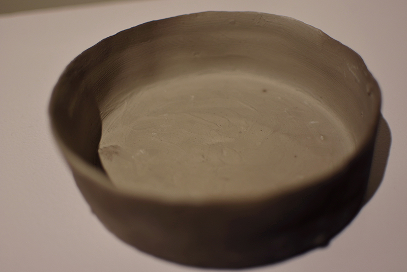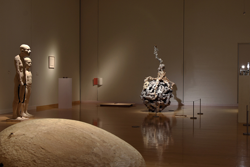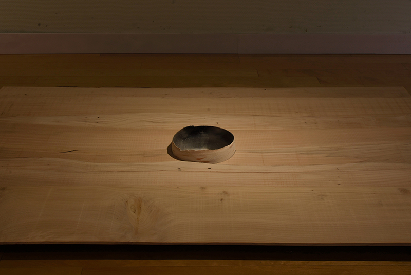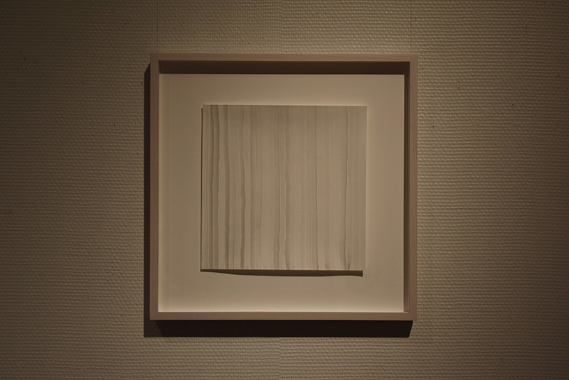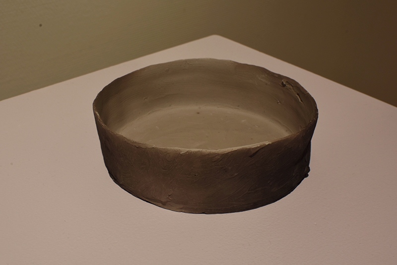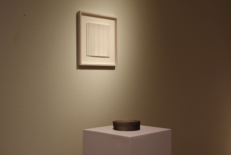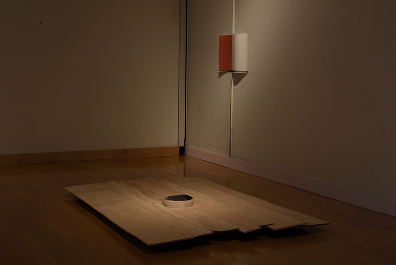 Installation of fired clay with soot, sumi ink on paper, print on paper, painted plinth, cedar low shelf
